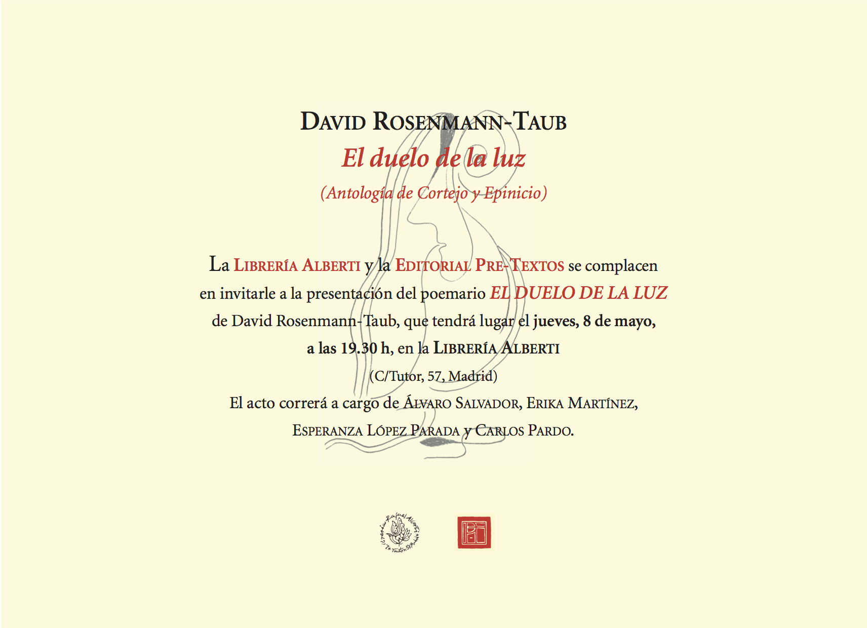 La Librería Alberti y la Editorial Pre-Textos se complacen en invitarle a la presentación del poemario El duelo de la luz, de David Rosenmann-Taub, que tendrá lugar el jueves 8 de mayo, a las 19.30 horas, en la Librería Alberti (calle Tutor 57, Madrid). El acto correrá a cargo de Erika Martínez y Carlos Pardo.