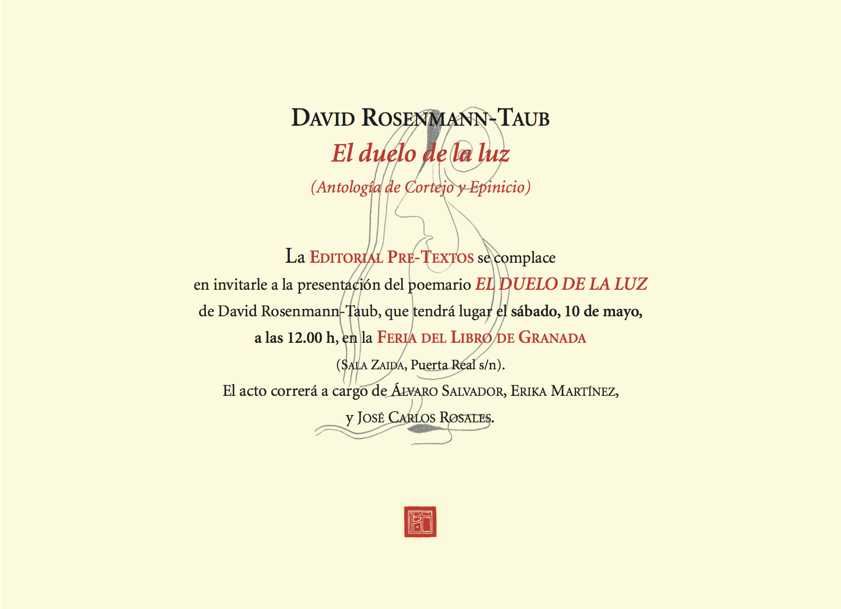 La Editorial Pre-Textos se complace en invitarle a la presentación del poemario El duelo de la luz, de David Rosenmann-Taub, que tendrá lugar el sábado 10 de mayo, a las 12.00 horas, en la Feria del Libro de Granada (Sala Zaida, Puerta Real, s/n). El acto correrá a cargo de Álvaro Salvador, Erika Martínez y José Carlos Rosales.